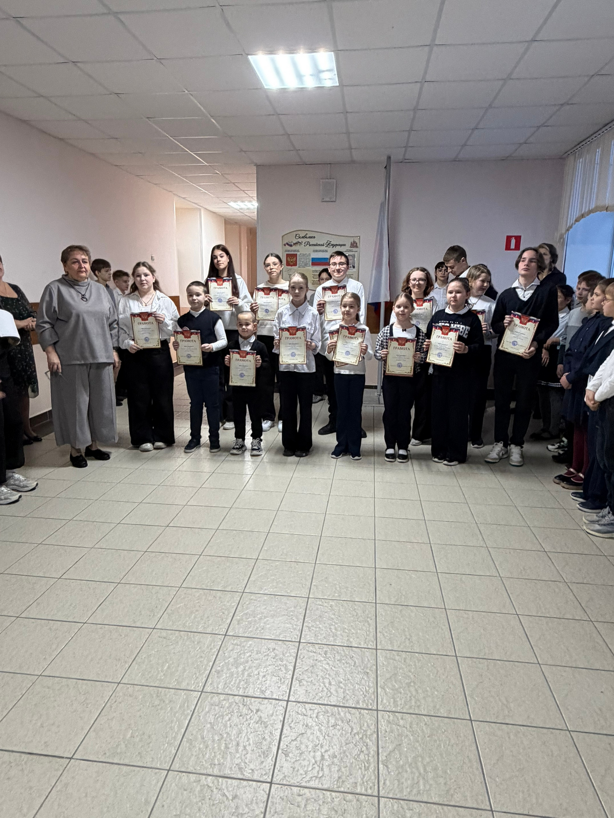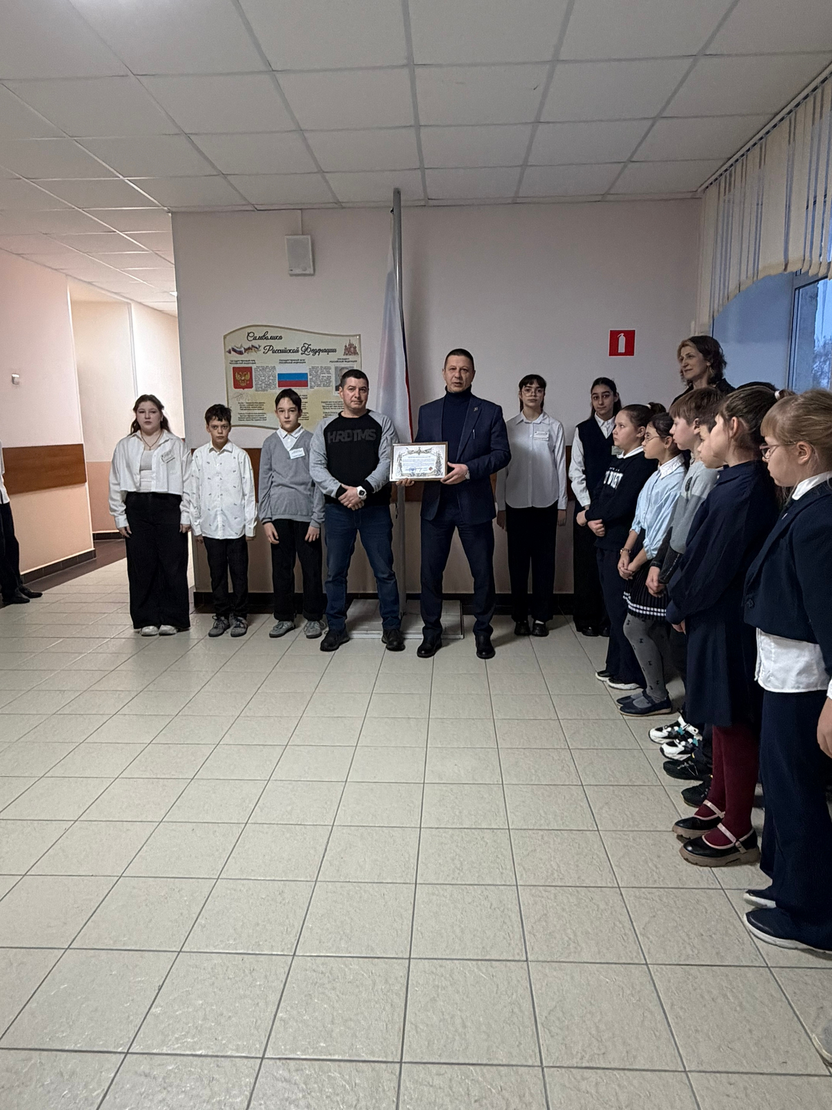 В школе утро понедельника началось с поднятия флага РФ, исполнения гимна РФ и награждения учащихся за конкурсы и олимпиады.